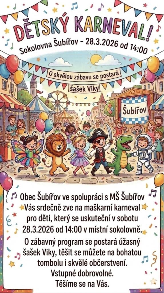 Srdečně Vás zveme na MAŠKARNÍ KARNEVAL, který de bude konat v místní sokolovně v sobotu 28.3.2026 od 14:00. O zábavu se postará šašek Viky, těšit se můžete soutěže, tanec, hudbu pro děti, bohatou tombolu a občerstvení.